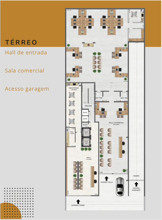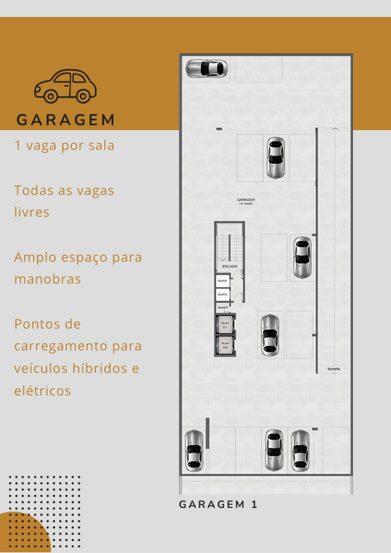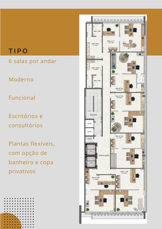 O edifício conta com salas comerciais com áreas privativas entre 31 m² e 35 m², ideais para empresas clínicas, escritórios, consultórios, startups, advocacia, contabilidade ou serviços profissionais que buscam visibilidade e circulação de clientes.
