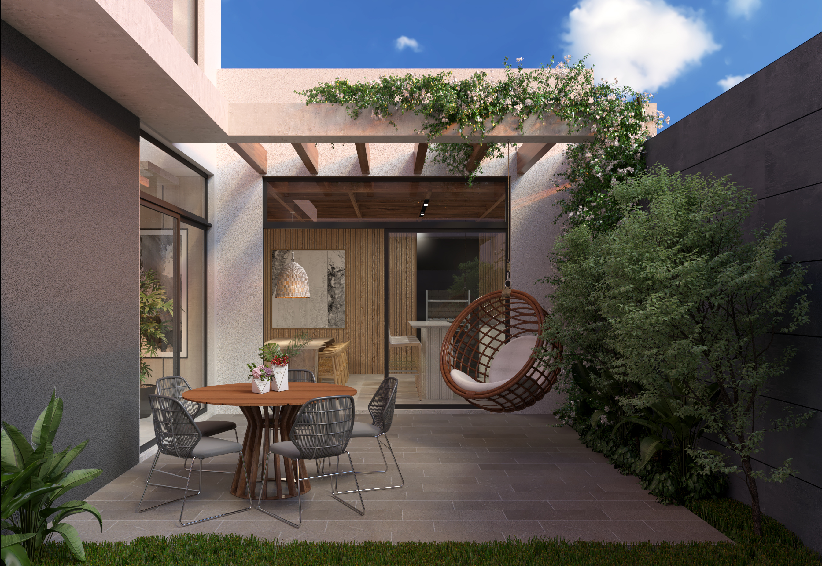 No térreo, o imóvel conta com garagem coberta para 2 veículos + 2 vagas descobertas, hall de entrada com pé-direito duplo, sala de estar e jantar integradas, cozinha, área gourmet com churrasqueira, lavabo e lavanderia.