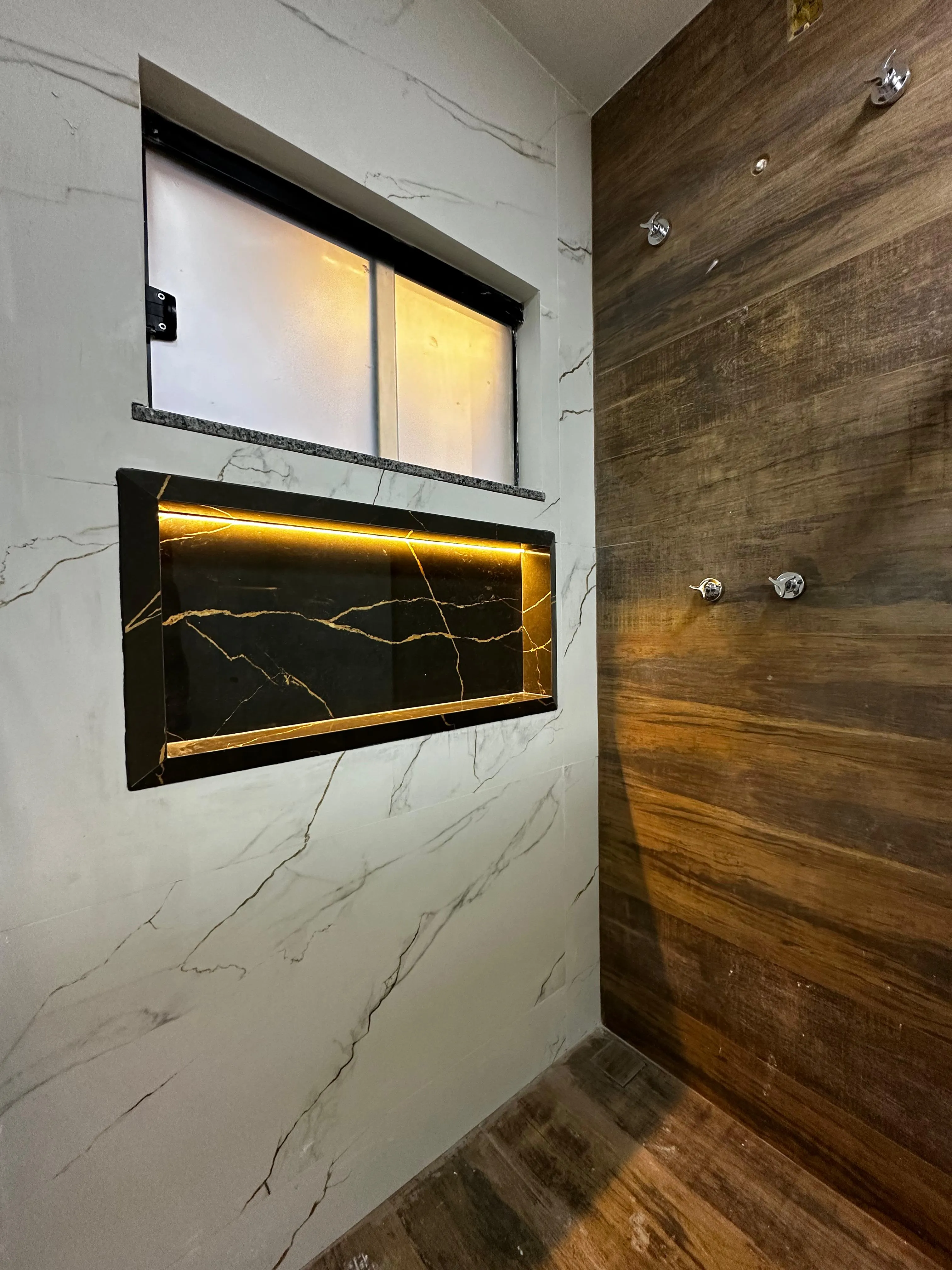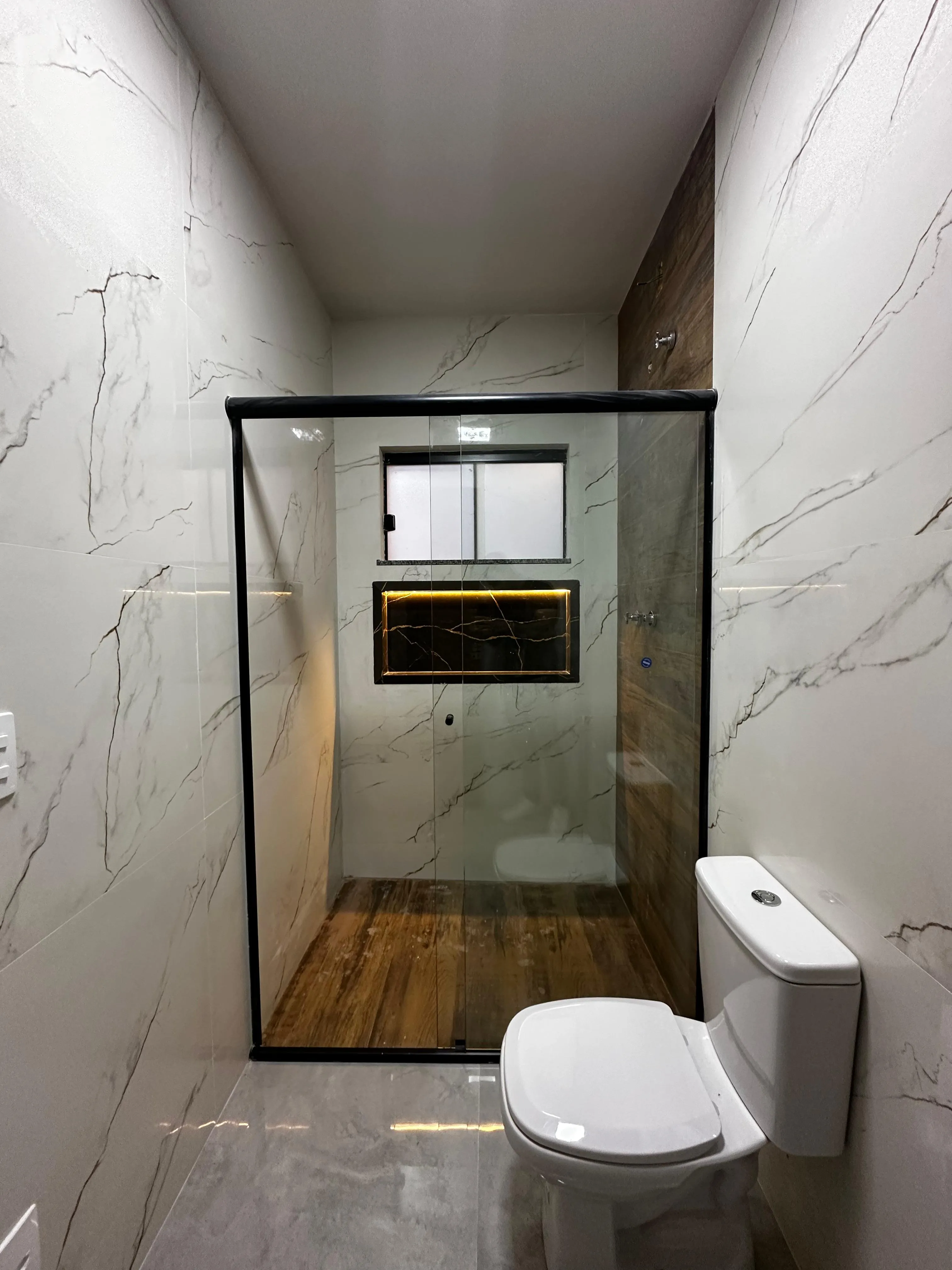 1 Banheiro com acabamentos em Porcelanato Marmorizado