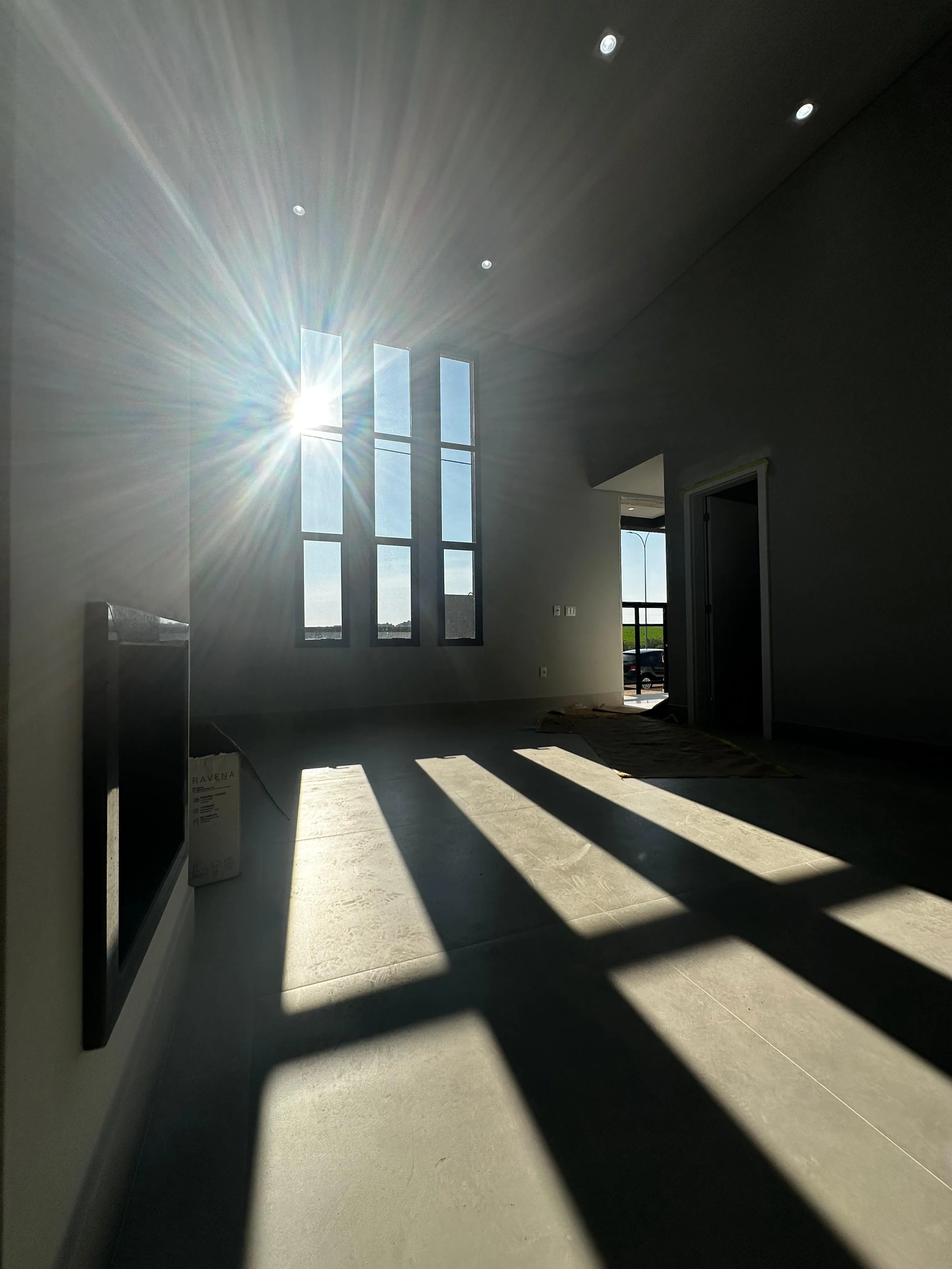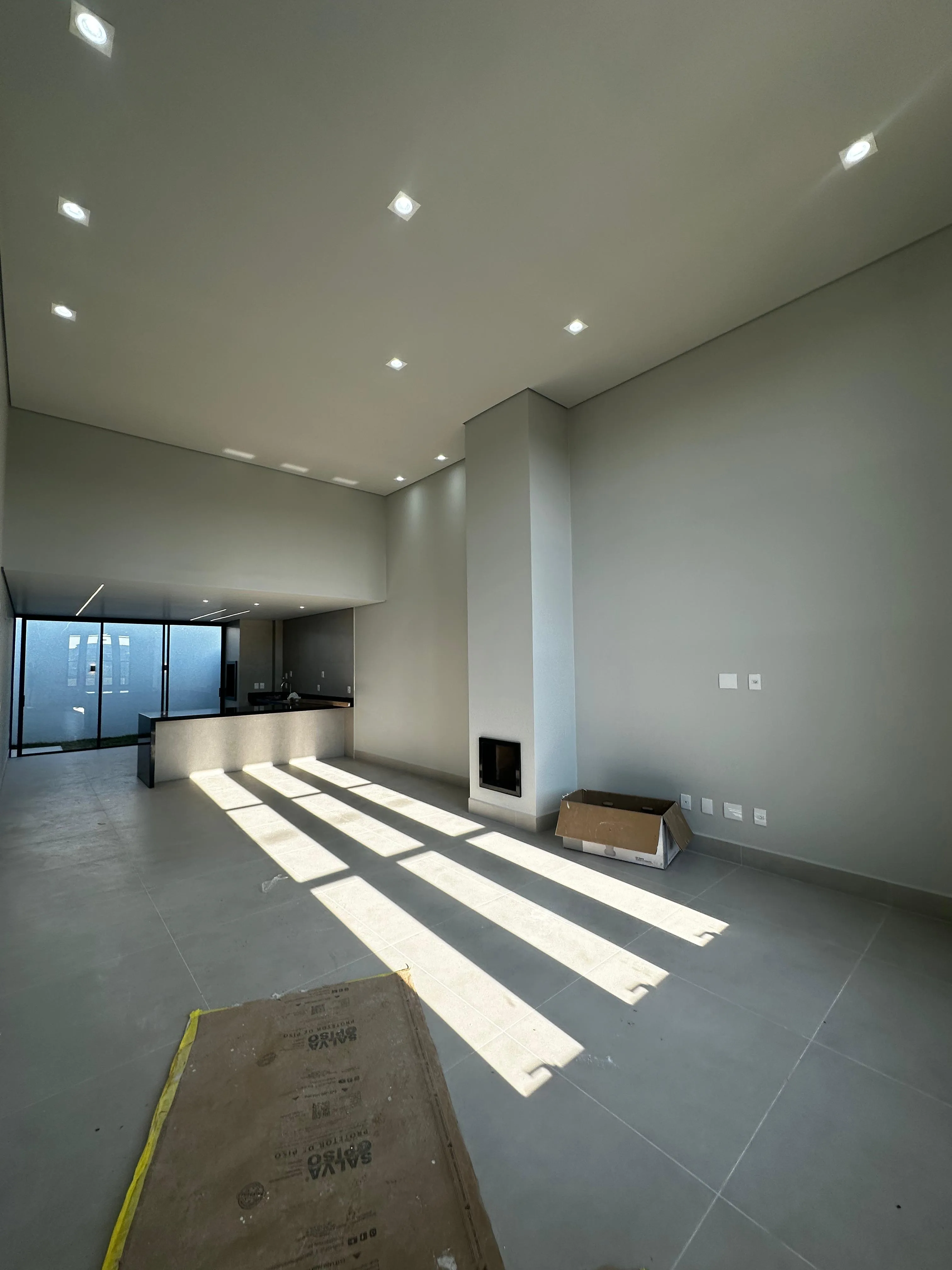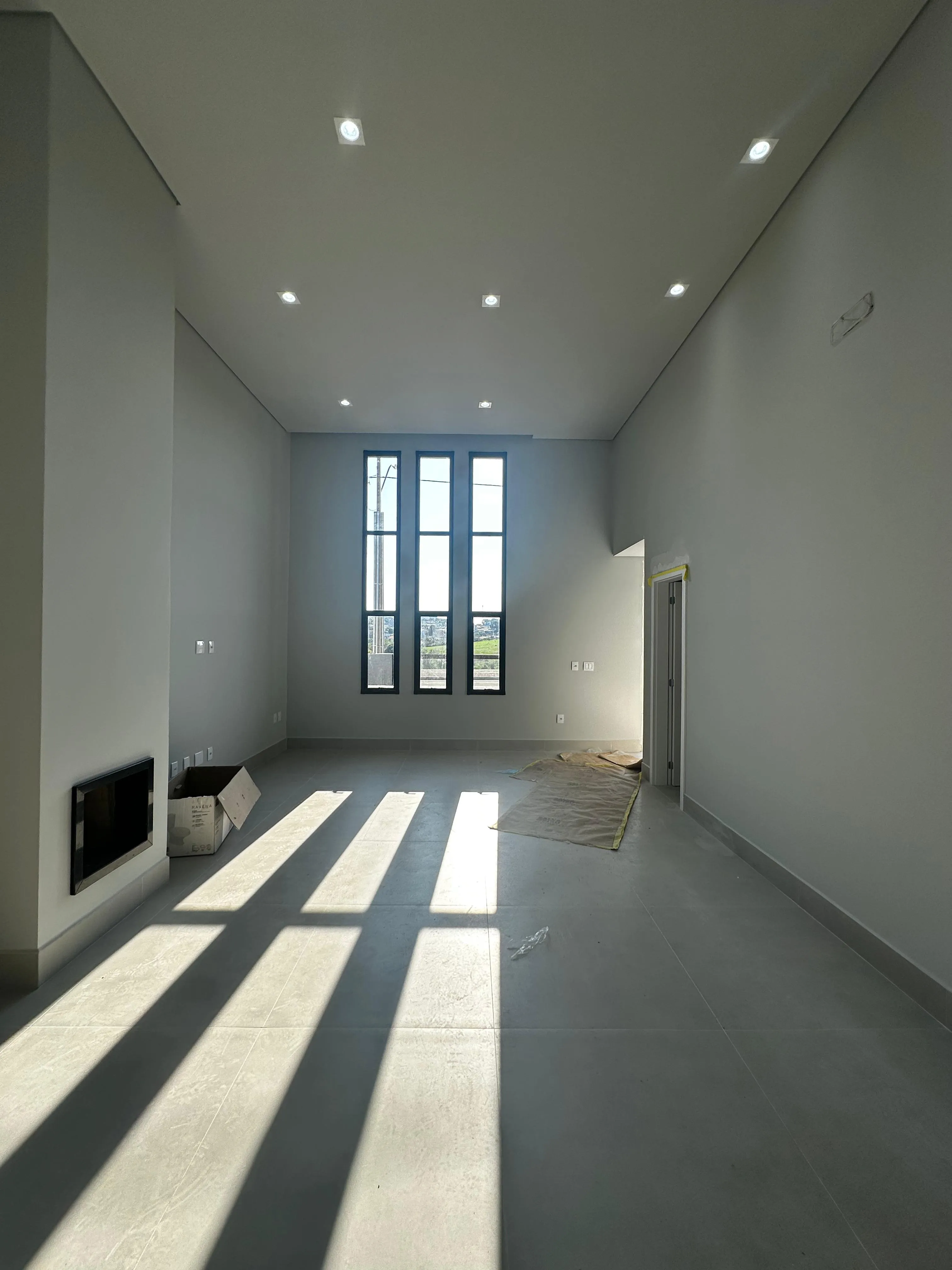 Sala com Pé Direito Alto: Com lareira, proporcionando um ambiente acolhedor.
