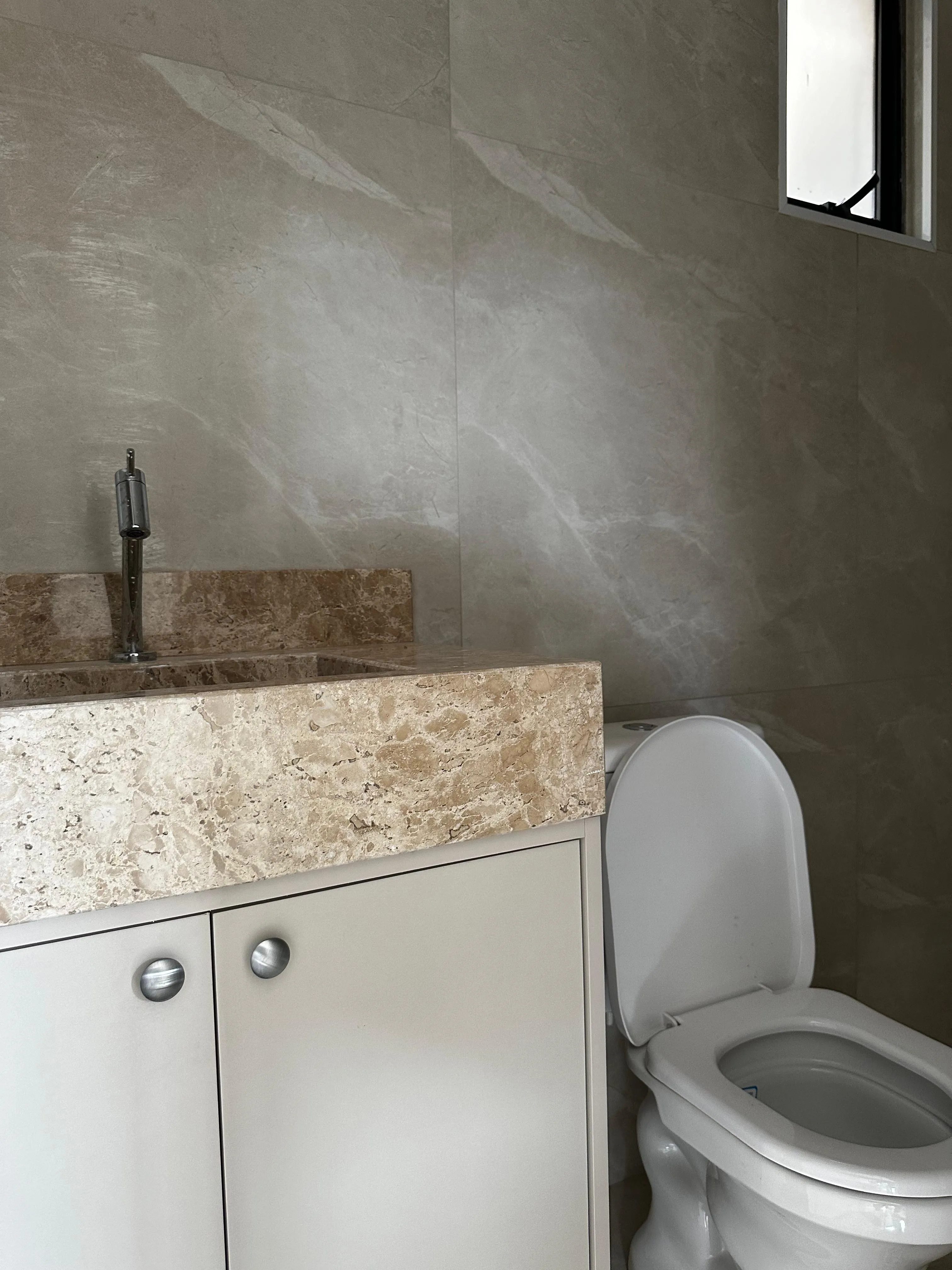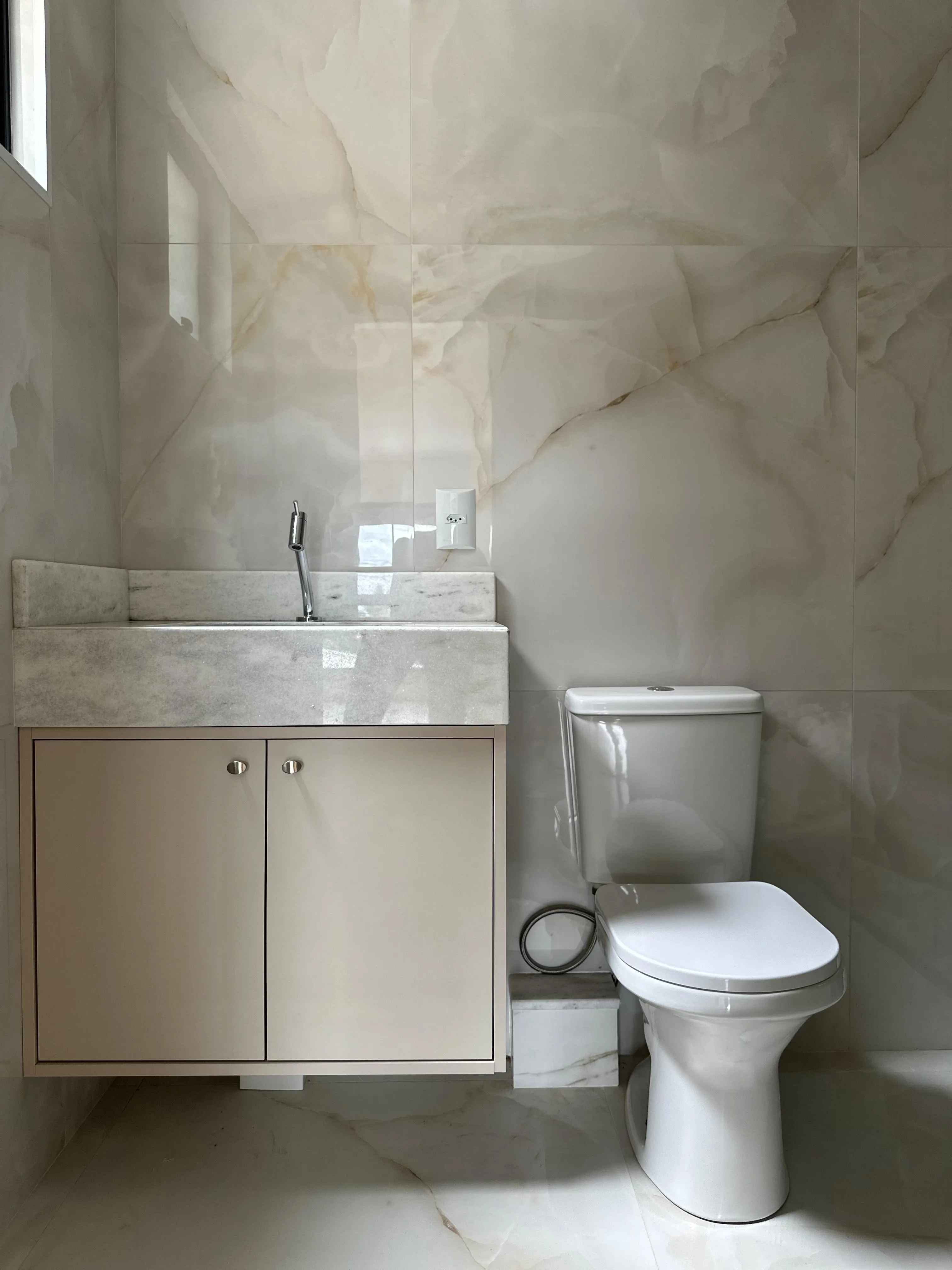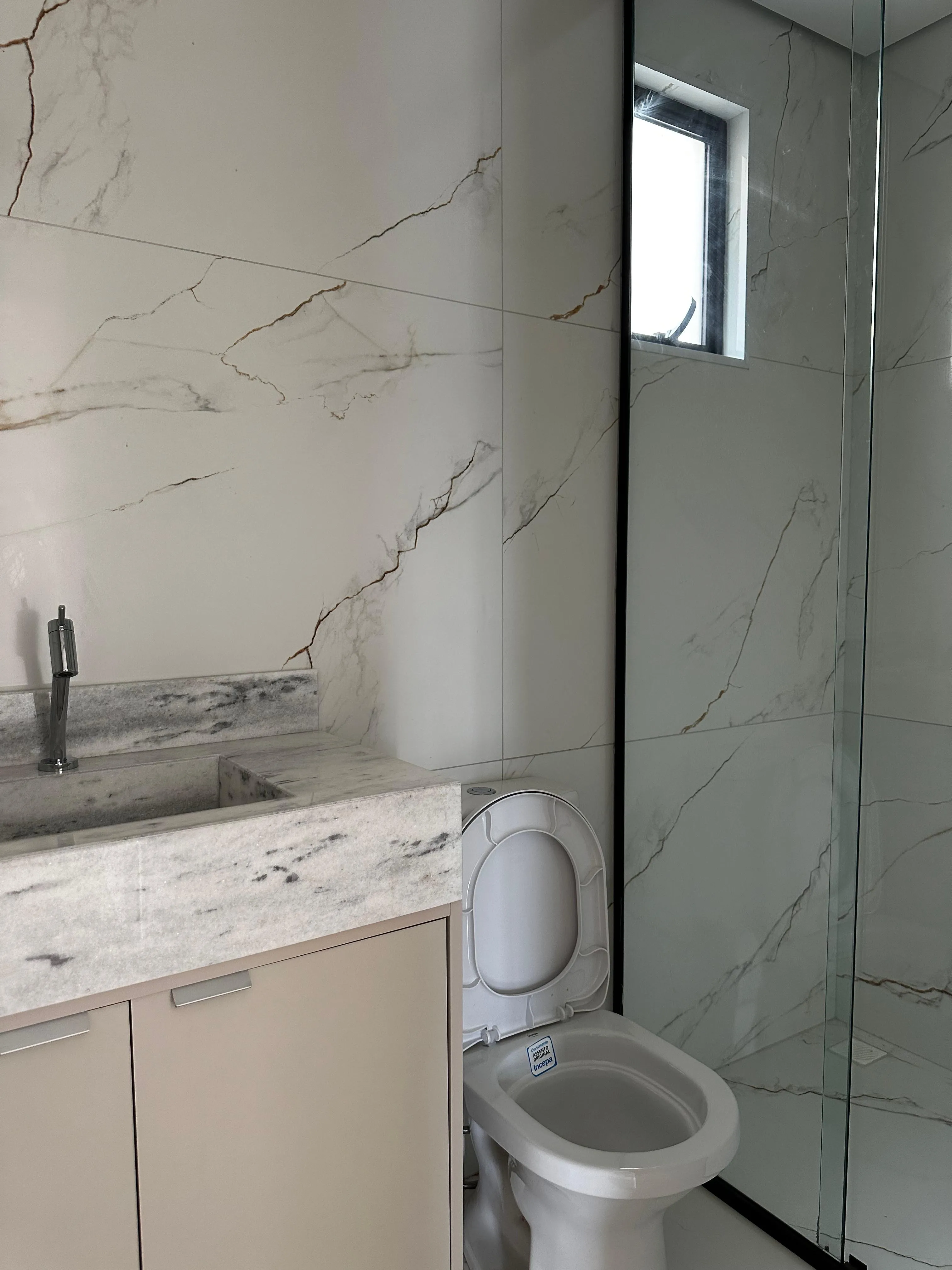 - Banheiros sofisticados, com cubas esculpidas em mármore e box com vidro até o teto;