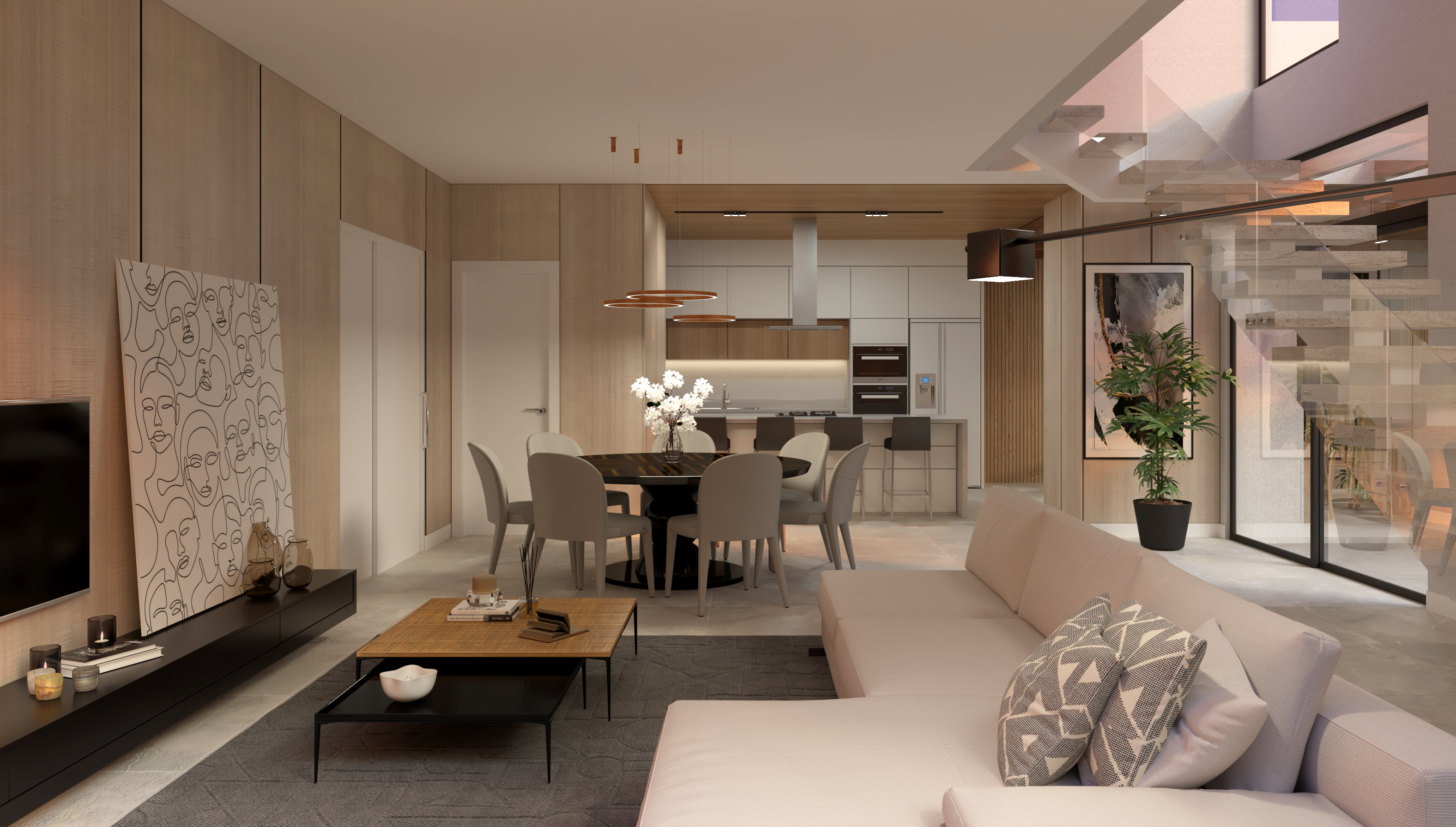 O sobrado oferece automação residencial completa (iluminação, ar-condicionado e persianas) com Alexa, energia fotovoltaica instalada, aquecimento de piso automatizado no banheiro da suíte master, fechadura eletrônica, portão eletrônico, interfone, cerca elétrica, infraestrutura para alarme e câmeras, som ambiente na sala de jantar e acabamentos de 1ª linha.