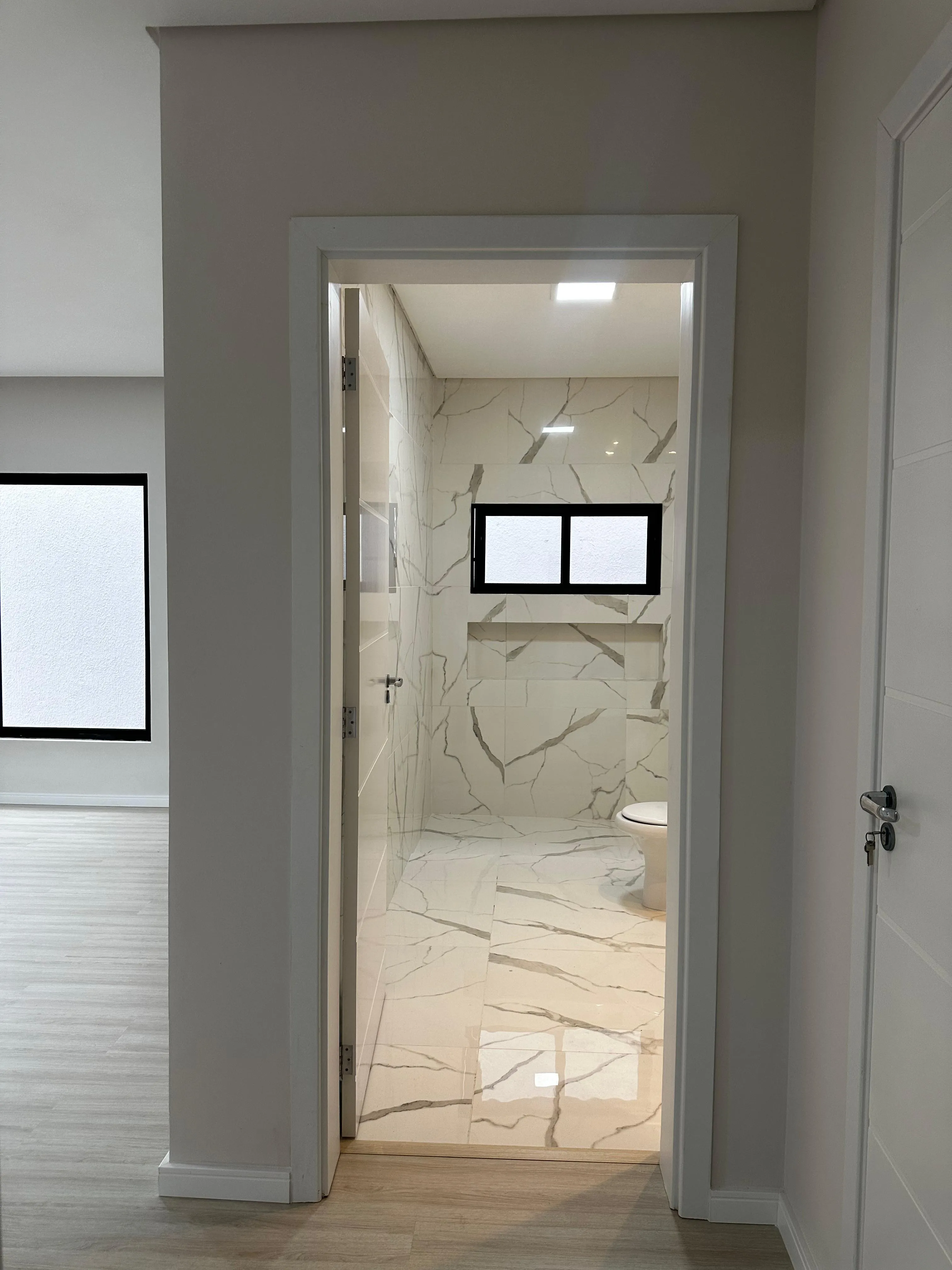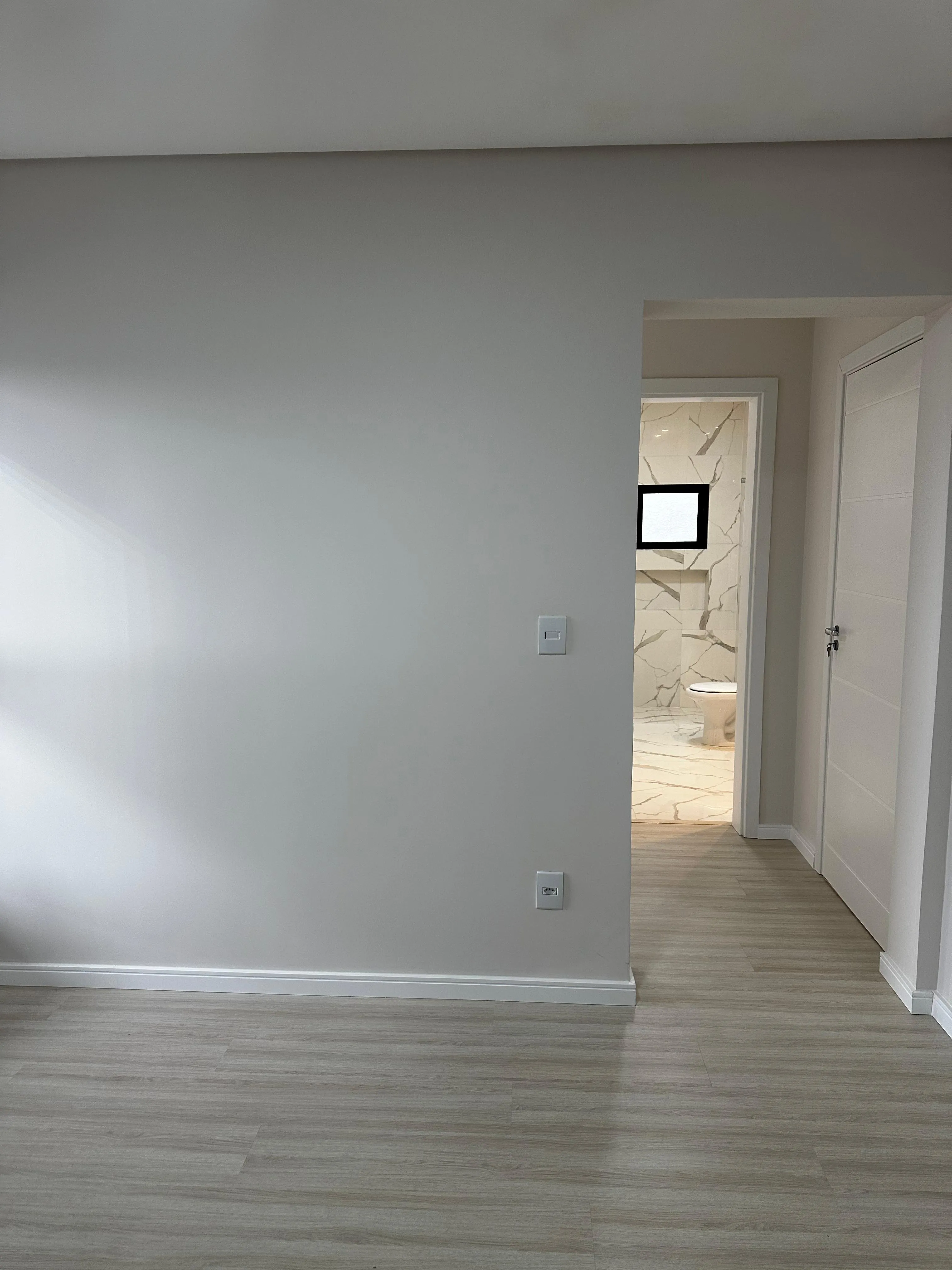 Acabamentos de alto padrão com piso laminado, porcelanato e detalhes em gesso, proporcionando um